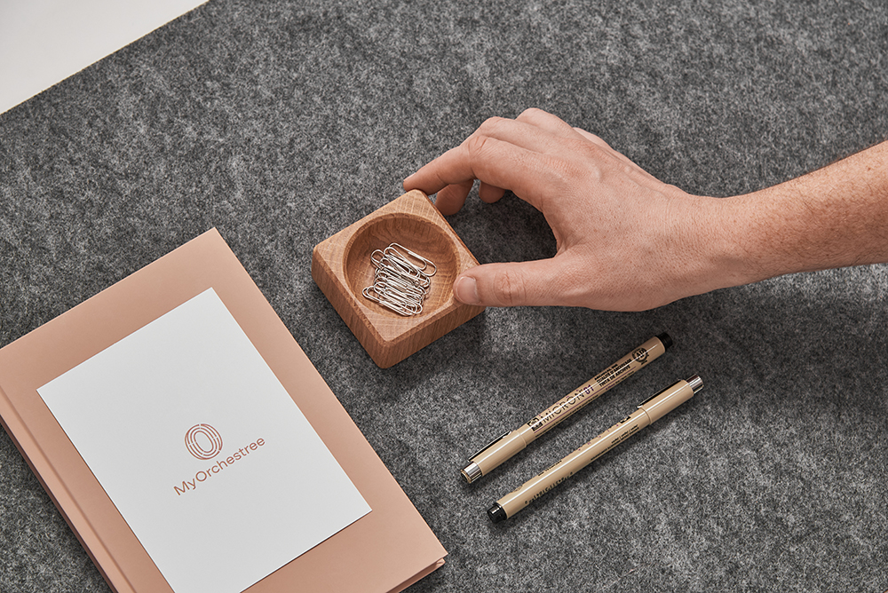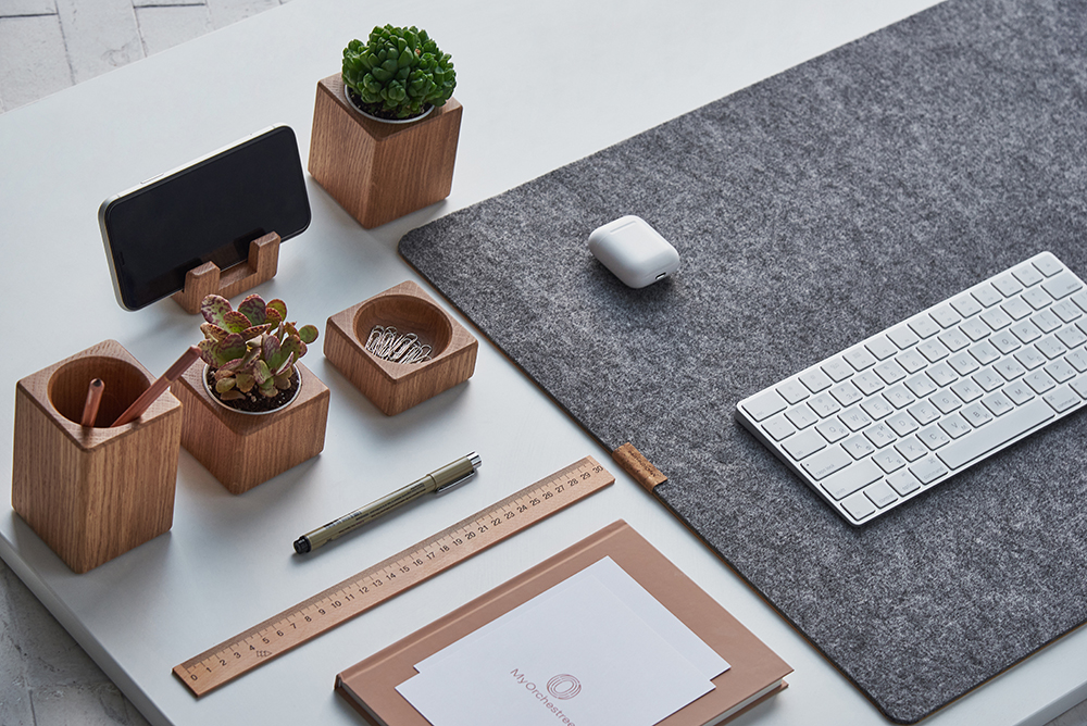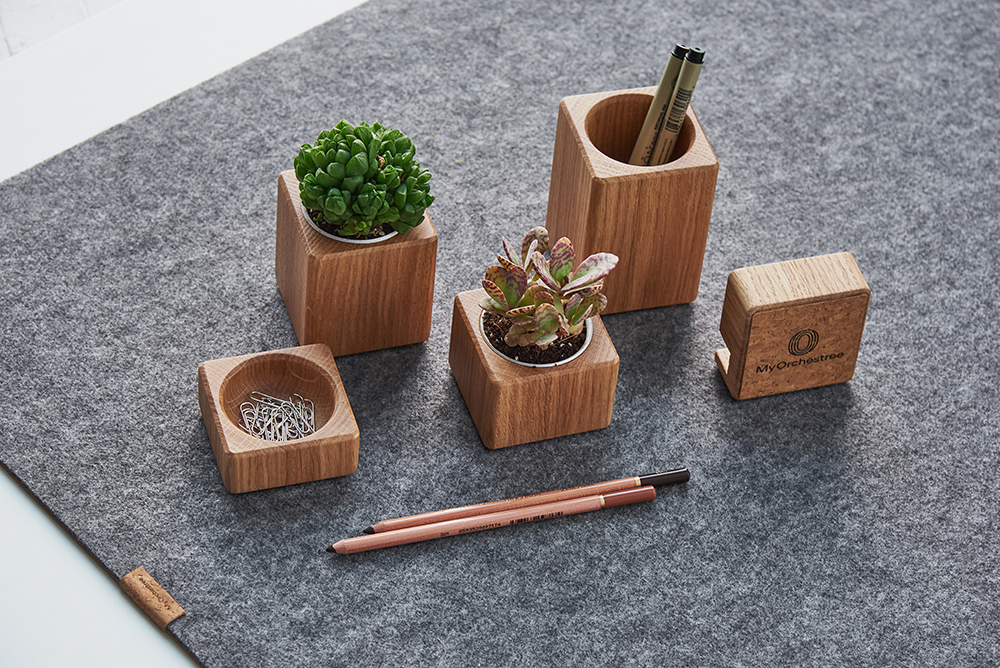 Робочому місцю тон задають деталі. Стильна підставка No.1 — елемент набору, призначений для зберігання дрібного канцелярського приладдя. Виконана з дубової деревини поверхня підставки оброблена олією. Ще один використаний природний матеріал — корок, вирощений у Португалії. Корковий шар на нижній основі виробу надає йому стійкості та захищає від пошкоджень.